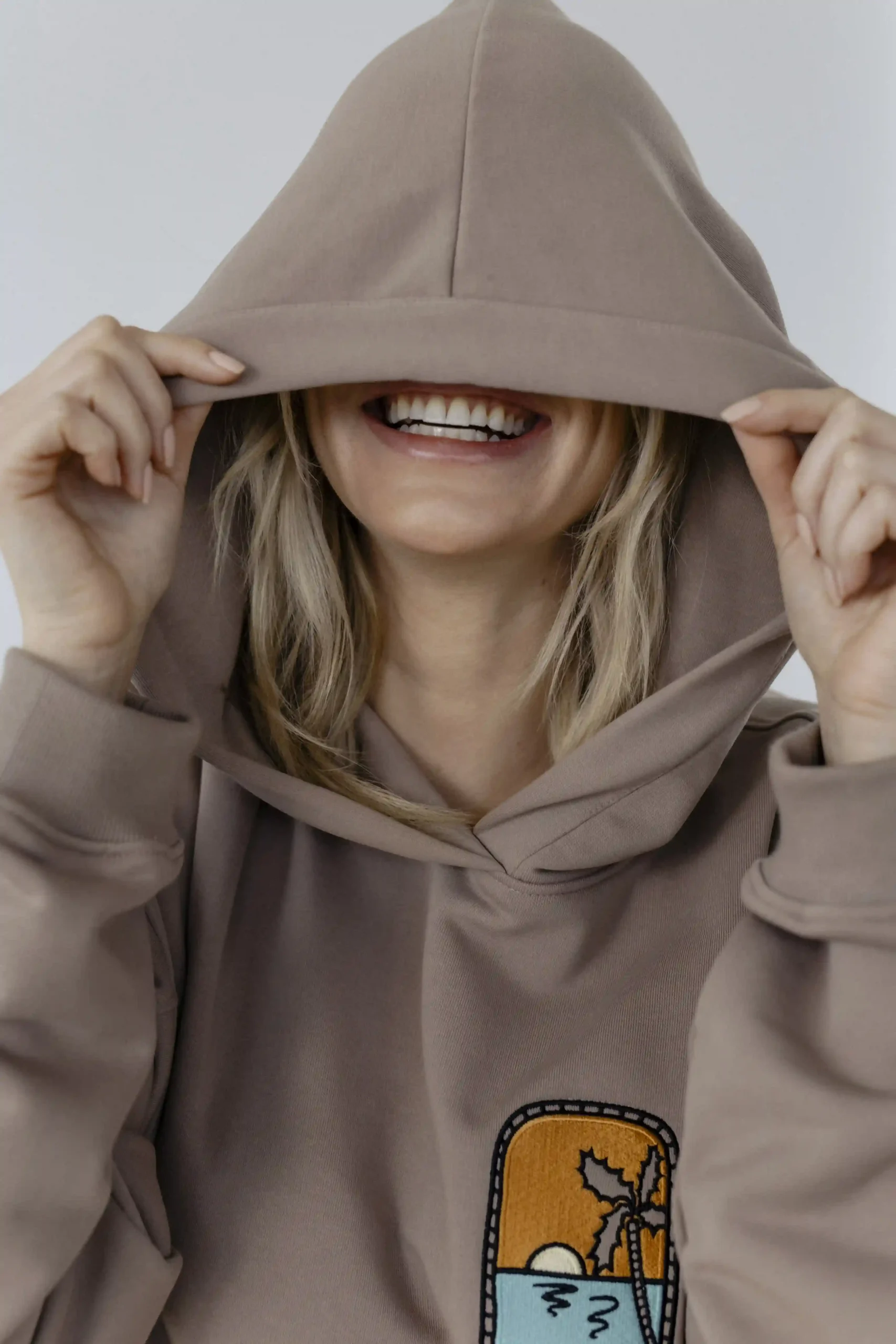 Bluza w kolorze mokka, z miękkiej, otulającej dzianiny. Luźny krój i wygodny kaptur zapewniają swobodę i komfort. Haftowana palma i słońce – subtelny detal, który przywołuje letni spokój, gdziekolwiek jesteś.