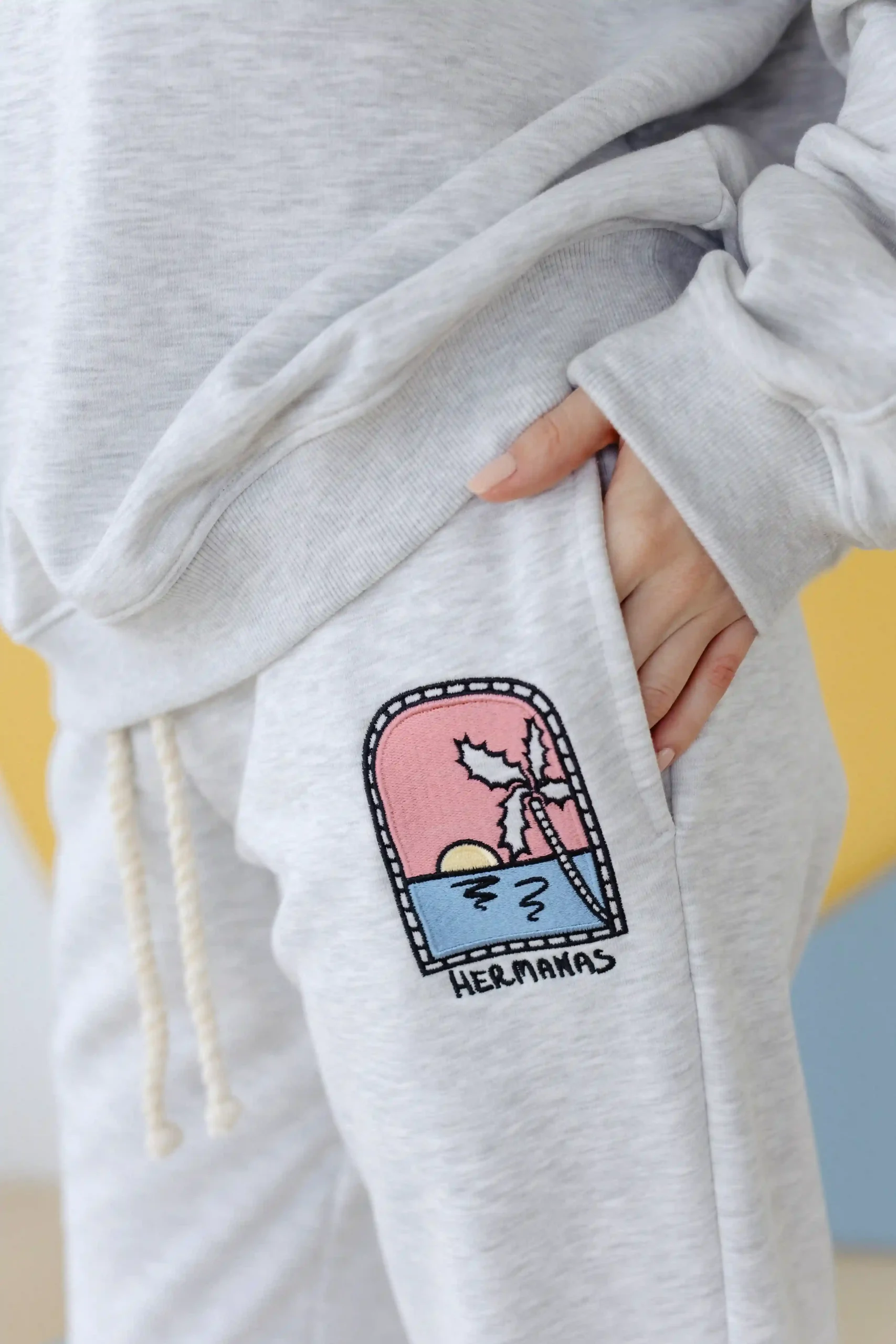 Spodnie w kolorze szarego melange. Zwężany krój, miękka tkanina, delikatnie elastyczna talia. Subtelny haft palmy i zachodzącego słońca przy kieszeni – detal dyskretny, ale znaczący.