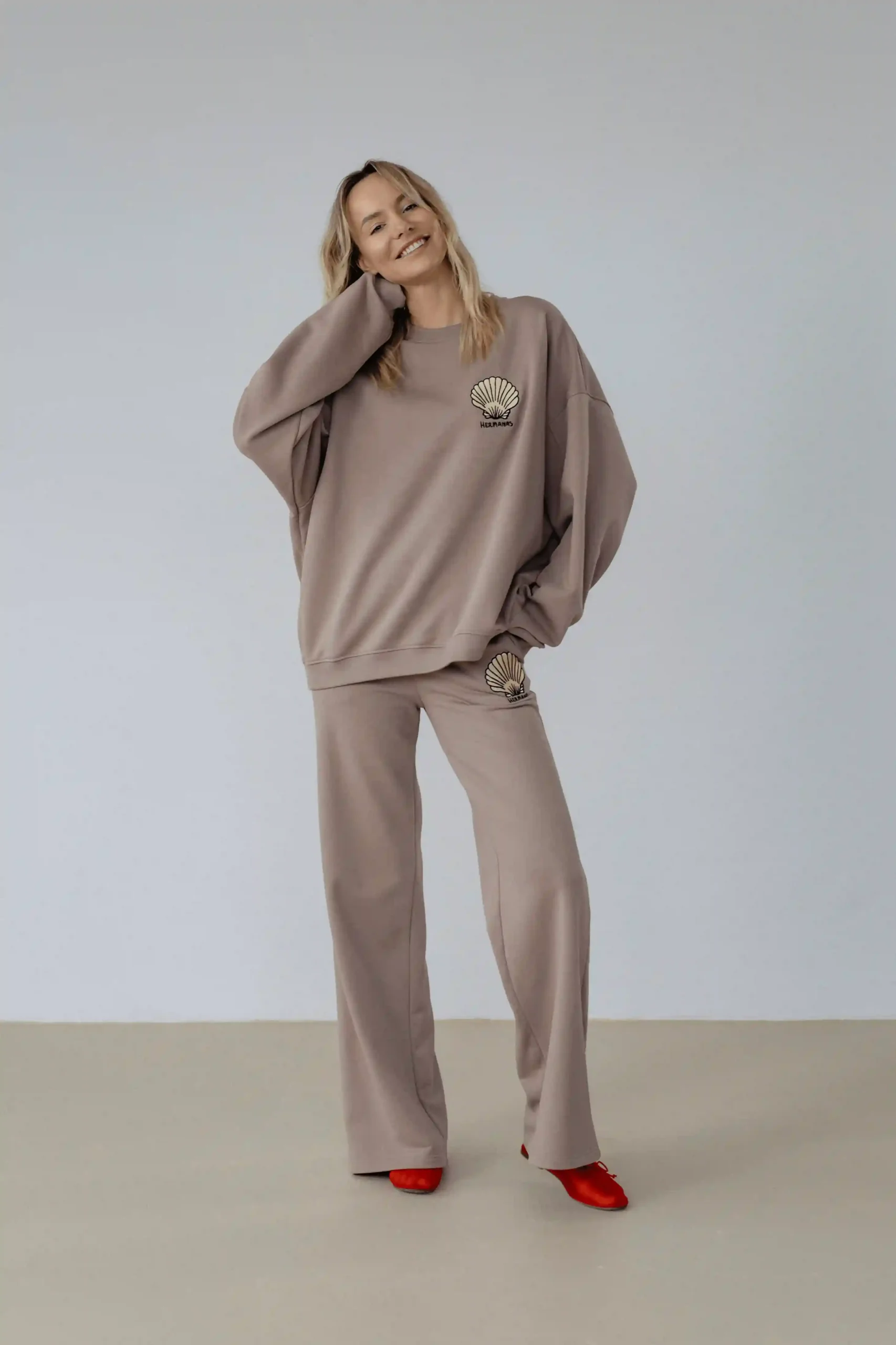 Spodnie w odcieniu szarego melange, o luźnym fasonie z rozszerzaną nogawką. Miękkie, lekkie, stworzone do noszenia w swoim tempie. Elastyczna talia dopasowuje się do ciała, a subtelny haft muszelki przy kieszeni dodaje prostego akcentu.